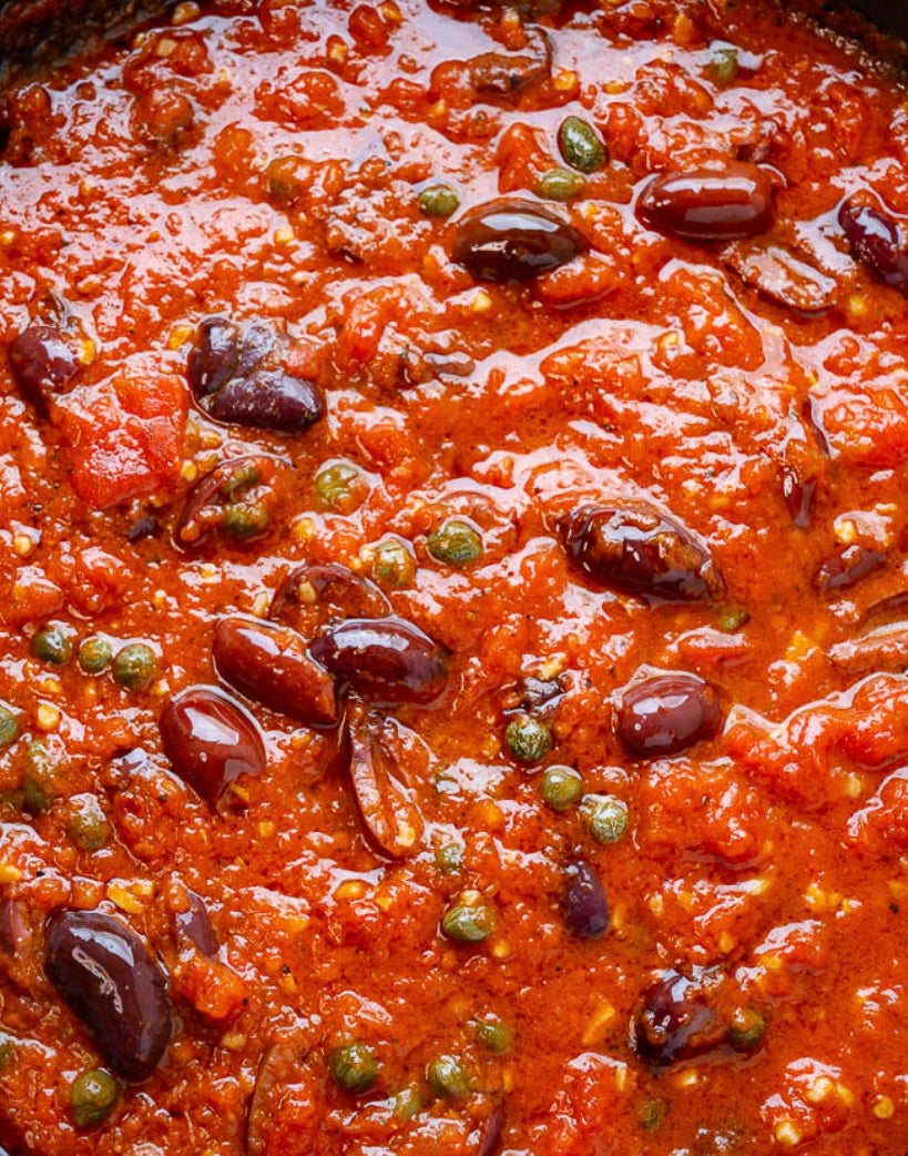 Delicious Puttanesca sauce, mild anchovy, Kalamata olive, capers, shallot, garlic